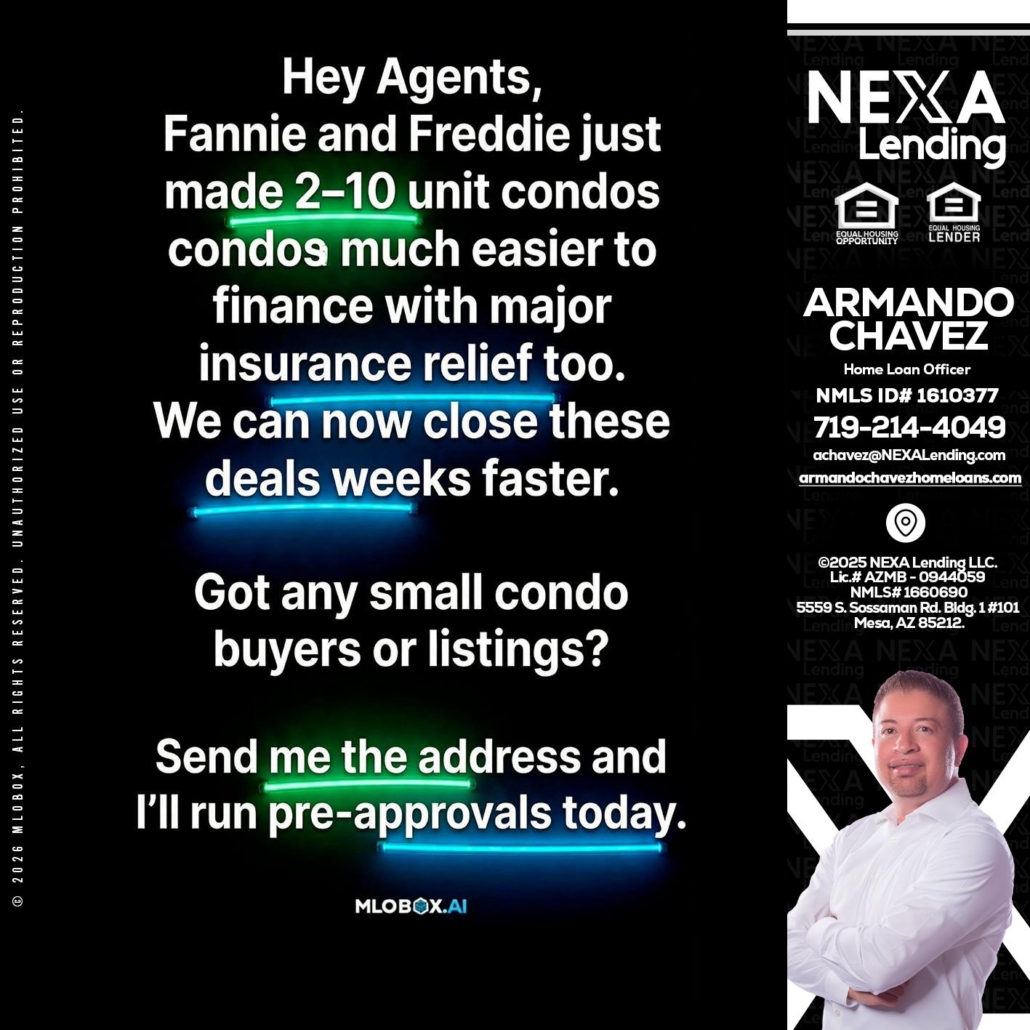 Hi, my name is Armando Chavez. I’m a Loan Officer with NEXA Lending LLC., offering personalized mortgage solutions, fast customized quotes, great rates and service with integrity.