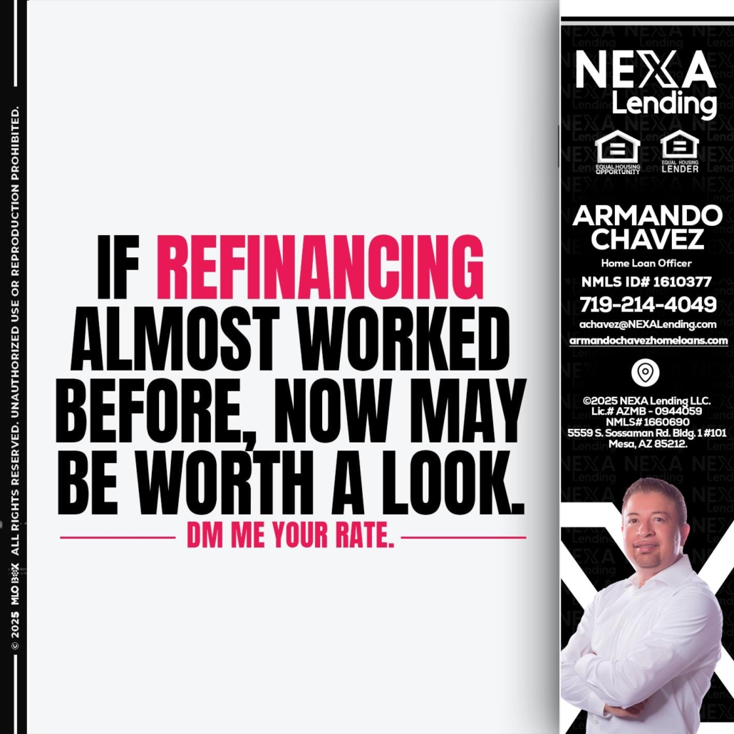 Hi, my name is Armando Chavez. I’m a Loan Officer with NEXA Lending LLC., offering personalized mortgage solutions, fast customized quotes, great rates and service with integrity.