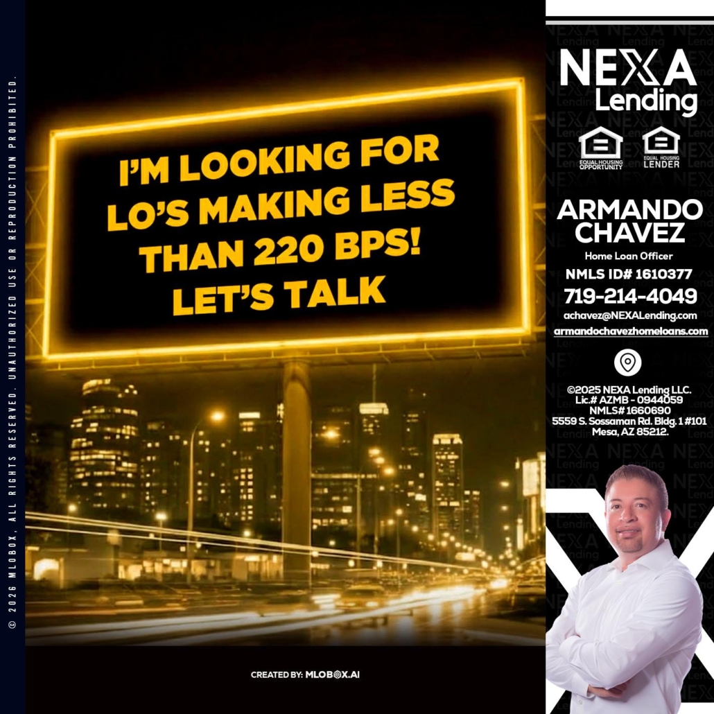 Hi, my name is Armando Chavez. I’m a Loan Officer with NEXA Lending LLC., offering personalized mortgage solutions, fast customized quotes, great rates and service with integrity.