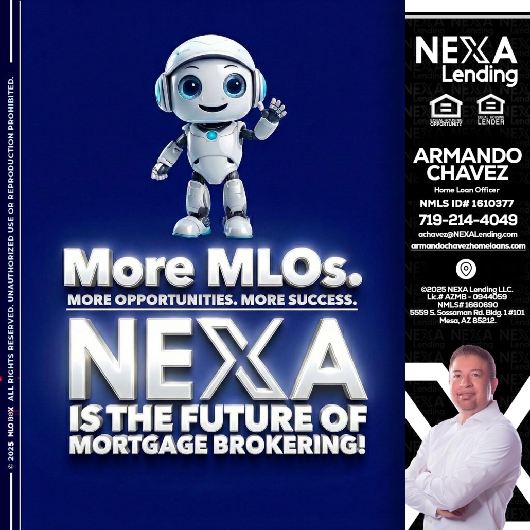 Hi, my name is Armando Chavez. I’m a Loan Officer with NEXA Lending LLC., offering personalized mortgage solutions, fast customized quotes, great rates and service with integrity.