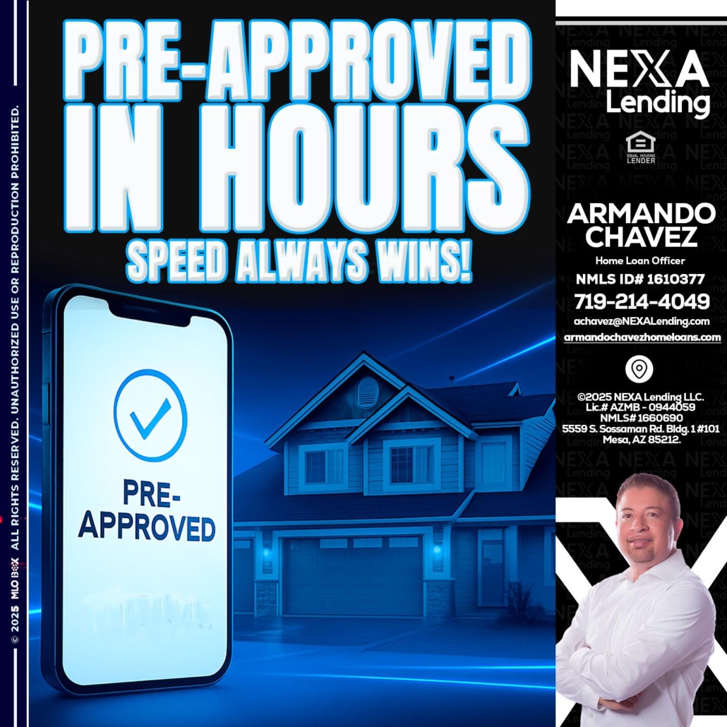 Hi, my name is Armando Chavez. I’m a Loan Officer with NEXA Mortgage LLC., offering personalized mortgage solutions, fast customized quotes, great rates and service with integrity.