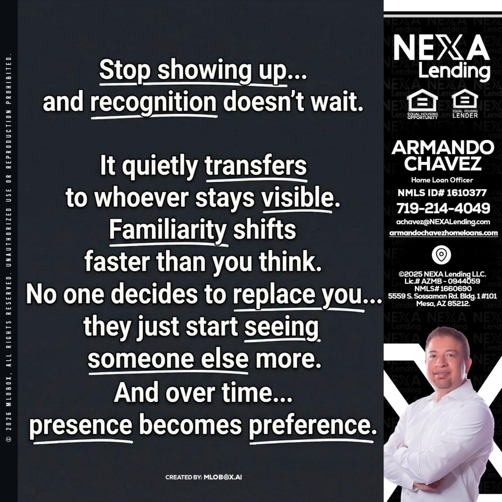 STOP SHOWING - Armando Chavez -Home Loan OfficerHi, my name is Armando Chavez. I’m a Loan Officer with NEXA Lending LLC., offering personalized mortgage solutions, fast customized quotes, great rates and service with integrity.
