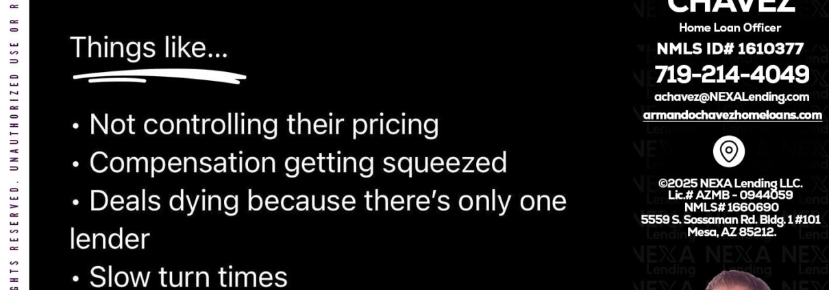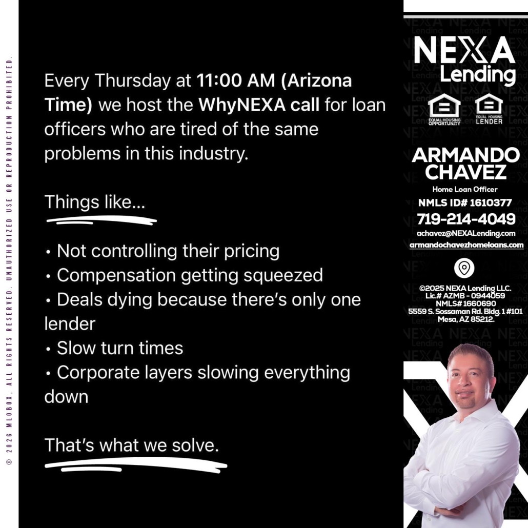 Hi, my name is Armando Chavez. I’m a Loan Officer with NEXA Lending LLC., offering personalized mortgage solutions, fast customized quotes, great rates and service with integrity.